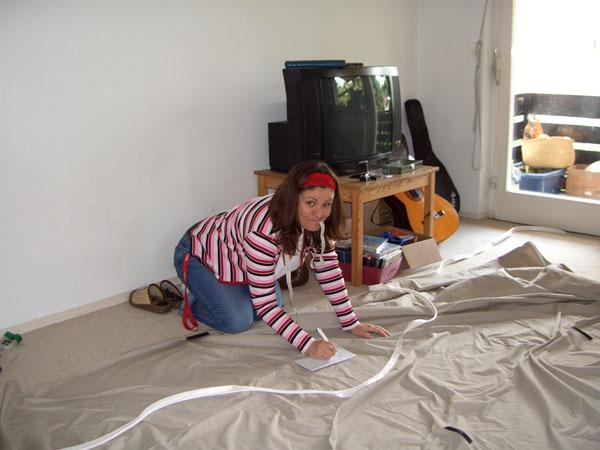 Sie hat uns in den letzten Tagen vor Abfahrt das super tolle Heckverdeck genäht. Ein Duschvorhang wurde mal schnell mit Magneten über dem ausgezogenen Heck fixiert. Mit ein paar Klebestreifen wurden die Kanten rechts und links geformt. Noch ein paar schwarze Linien drauf - manche davon nur gepunktet - fertig. Wir konnten uns nie vorstellen, das aus dieser Vorlage ein passgenaues Heckverdeck werden sollte. Es sah eher wie ein Stück Plastikfolie für den gelben Sack aus. Zwei Tage später wurde genäht. Vor der letzten Naht wurde das Verdeck noch einmal am Bus angepasst dann war es fertig. Ohne Anna wären wir beim Regen ganz schön nass geworden. Bis jetzt haben alle Nähte gehalten und das Verdeck wird oft bewundert.