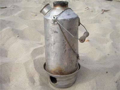 "Vulkan" Wasserkocher: Ist Gas und Benzin alle, kann mit diesem Wasserkocher zumindestens noch eine heisse Suppe oder ein Kaffee beziehungsweise Tee gekocht werden. Ein paar Stöckchen hinein und anzünden. Durch die Kaminwirkung kocht ein Liter Wasser in etwa 5 Minuten. Auch gut zum Erhitzen von grossen Mengen von Waschwasser. Praktisch unkaputtbar.