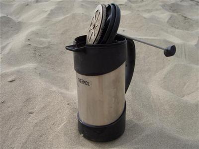 Thermos Kaffeekanne: Kaffeekanne mit eingebautem Filter. Man braucht nie wieder ein Filter und verwendet etwa nur halb so viel Kaffeepulver. Und der Kaffee bleibt auch bei Minusgraden schön lange heiss. Unkaputtbares Edelstahlgehäuse.