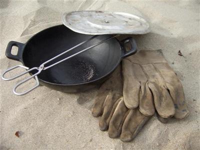 "Outdoor" Brotbackset: Ein gusseiserner Wok, Aludeckel (den braucht man für die Oberhitze :-), Grillzange und -handschuhe. Damit lässt sich auf jeder Glut ein Brot oder ein Kuchen backen. Sehr praktisch und unkaputtbar.