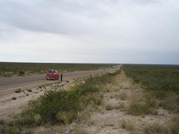 Wir brechen auf in Richtung Valdes. Es liegen noch knapp 800 Kilometer vor uns - die Wale sollen noch zu sehen sein, aber es werden langsam weniger. Also vollepulle runterkacheln - Argentinien ist verdammt gross. Die nächsten zwei Tage lassen sich etwa so beschreiben: 120 Kilometer gerade aus, dann eine leichte Kurve nach links und wieder 80 Kilometer gerade aus. Dann eine scharfe Kurve nach rechts und wieder 200 Kilometer gerade aus. Rechts Zäune und links auch Zäaune. Wir fragen uns wer die Büsche eingezäunt hat und warum.