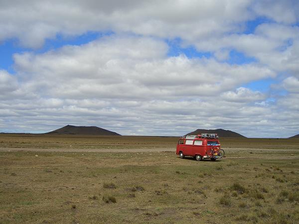 Bevor wir nach Feuerland fahren übernachten wir kurz vor der chilenischen Grenze an einem Vulkan. Die Ganze Landschaft ist mit Vulkanen übersäht, die alle paar Kilometer aus der Ebene herausragen. Es gibt einen tollen Sonnenuntergang und wir sehen Füchse, die direkt an unserem Bus vorbeilaufen ohne uns zu beachten. Wiehnachten sind wir im Nationalpark Terra del Fuego. Endlich gibt es mal wieder Bäume zu sehen und aus den Flüssen können wir trinken. Und es gibt keine Zäune, wie sonst überall. Wir sehen Füchse und füttern Milane und Falken mit Fleischresten.