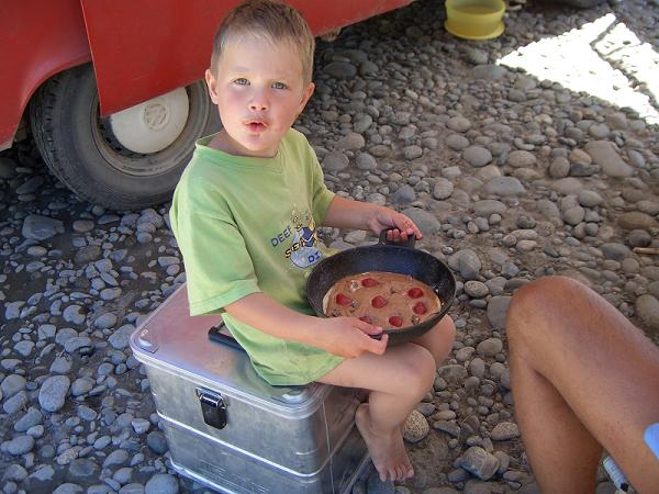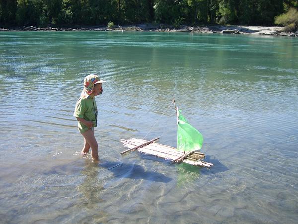 Den Geburtstag von Elias feiern wir am Rio Palena. Es gibt einenauf dem Feuer gebackenen Erdbeerkuchen. Dazu das erste eigene Messer mit Gürtel für Elias - womit er auch gleich anfing alles zu zerschnibbeln. Das Wetter ist schön und wir bleiben ein paar Tage. Die letzten Wochen sind wir auch zu viel gefahren. Wir backen Sauerteigbrot aus selbstgemahlenem Korn auf dem Feuer, waschen alle unsere Sachen und bauen für Elias ein Bambussegelschiff - einfach erholsam...