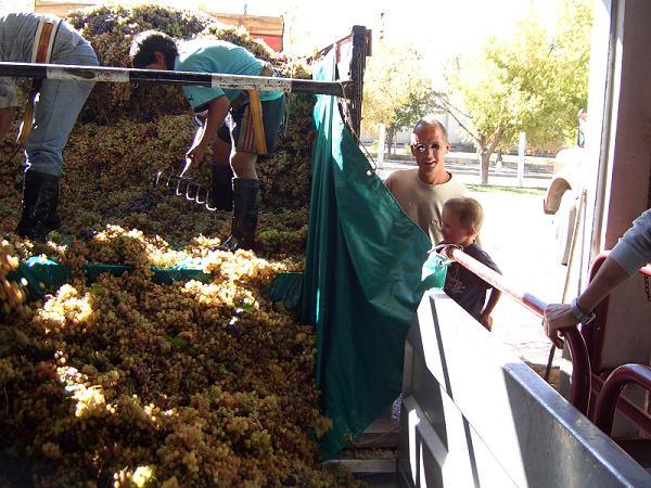 Die Blätter an den Bäumen leuchten in herbstlichen Farben. Im Hintergrund die Kulisse der Anden. Die Weinernte hat begonnen. Grund genug eine Führung durch eine Winzerei, an der gerade die Trauben abgeladen werden, zu machen. Drei junge Praktikantinnen haben die Ehre uns durch die Anlage zu führen. Gickelnd geht es durch Keller und zwischen Fässern hindurch.