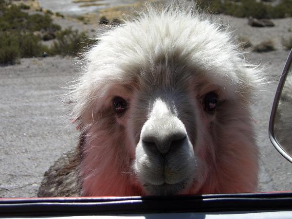 Zwischendurch sehen wir immer wieder Lamas. Die sind völlig neugierig und stecken sogar ihren Kopf in unser Auto. Es gibt einen Apfel für das Lama und wir können das schöne, weiche Fell streicheln. Für einen kurzen Moment überlegen wir, ob wir in dieser Höhe nicht noch ein zusätzliches Fell gebrauchen könnten....