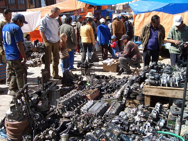 Wir vertrieben uns die Wartezeit mit dem Erkunden von La Paz. Frisch gepresster Orangensaft für ein paar Eurocent, gepoppter Mais in allen Formen und Farben, Fleischspiesse, Erdbeerkuchen und immer wieder Eis. In El Alto gibt es Donnerstags einen riesigen Markt auf dem man alles bekommt. Von rostigen Kugeln für Kugellager bis hin zu gebrauchten Annanasschalen :-) Wirklich alles. Schöne bunte Tragetücher - so wie sie die bolivianischen Frauen verwenden. Die mussten natürlich mit. Und einen Frosch für Elias. Und Zusatzscheinwerfer für den Bus. Und und und. Hier kann man für etwa 20 Euro den ganzen Tag schoppen gehen und kommt abends vollgepackt ins Hotel. Natürlich fährt man mit dem Minibus - etwas grösser als ein VW-Bus. Es werden 18 Leute reingepresst. Das ist warm und lustig und kostet fast gar nichts.