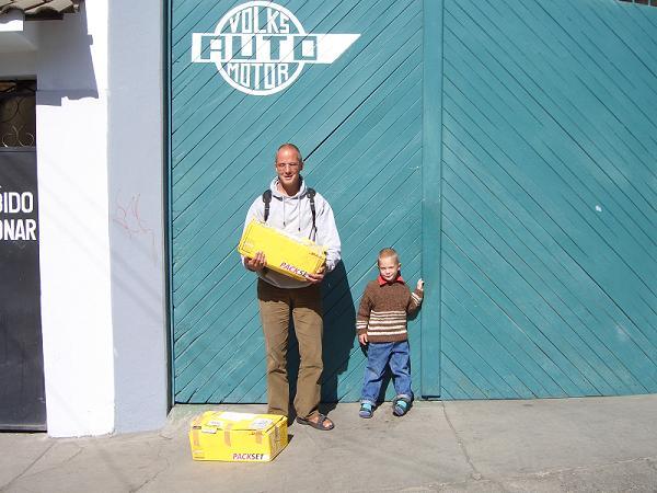 "No Factura?" fragt der Zollbeamte. Wir schauen uns fragend an. Was ist nur aus Deutschland geworden? Die haben wirklich keine Factura reingelegt. Wo soll das hinführen. "Quanto vale?" fragt der Zollbeamte. Ne nix Wale "Esta es autoteile!". Der Mann vom Zoll zeigt auf ein Schild auf dem so etwas wie zollfrei bis 100 US-Dollar pro Empfänger steht. Wir versuchen es mal mit 200 US-Dollar - immerhin sind es mehr als 16 Kilogramm Ersatzteile. Der Mann vom Zoll meint nur Euro! Richtig, hätten wir fast vergessen! In Alemania wird ja immer noch mit Euro bezahlt. Der Mann vom Zoll tippt an einem Taschenrechner herum und sagt anschliessend 252 US-Dollar. Wir schauen uns fragend an. Das wären ja über 100 Prozent Einfuhrzoll. Während wir noch damit beschäftigt sind unsere Kinnlade wieder zu schliessen, schiebt uns der Zollbeamte einen Zettel zu. Auf dem Steht eine Adresse und 574 Bolivianos. Das sind gerade mal 57 Euro Zoll. Das sieht schon besser aus. Mal schauen, ob wir dem netten Beamten noch klar machen können, das darin auch das dritte, noch fehlende Paket eingeschlossen ist :-) Auf jeden Fall war uns der Zollbeamte sehr gut gesonnen. Vielleicht haben aber auch Elias Bestechungsversuche mit Popkorn geholfen...