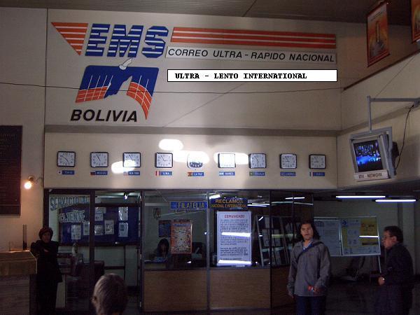 Und zwischendurch immer wieder zur Hauptpost. Auch hier als Emblem ein geköpftes Huhn. Dazu der Hinweis: "ULTRA - RAPIDO NACIONAL". Da lachen ja die Hühner! Um auf die Probleme deutscher Minderheiten in Bolivien aufmerksam zu machen, bringen wir ein entsprechendes Transparent an. Wie sich später herausstellte, leider mit Schreibfehler (soviel zur deutschen Schulbildung :-), wahrscheinlich hat uns deshalb hier keiner ernst genommen.