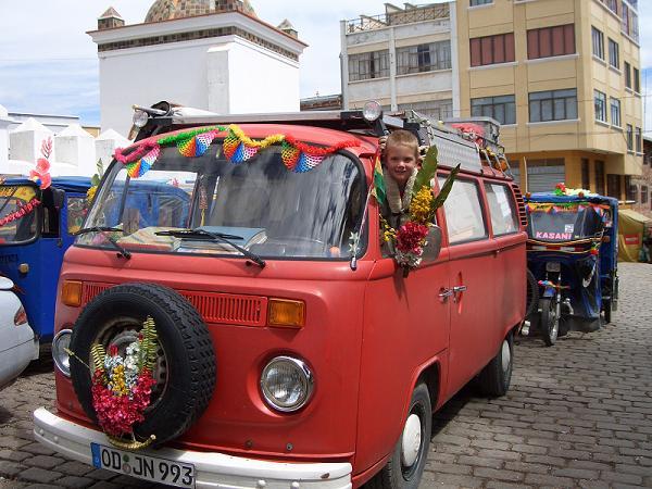 Wir beschlossen unseren Bus auch weihen zu lassen - kann bei der schlechten Werkstatt ja nichts schaden. Wir schmücken den Bus mit Blumen und Girlanden. Man kauft Bier, um das Auto nach der Weihung damit zu bespritzen. Anschliessend wird das nasse Auto mit Konfetti beworfen.