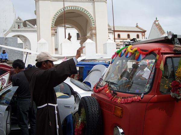 Vor einer grossen Kirche in Copacabana kann man allerlei Blumen-, Papier- und Plastikschmuck kaufen. Wenn man sich in Bolivien ein Fahrzeug kauft, egal ob neu oder gebraucht, lässt man es hier von einem Priester weihen. Das gleiche kann man mit allen Gegenständen machen, die einem am Herzen liegen. Auch Flugtickets lässt man weihen, um nicht abzustürzen. Selbst aus Peru kommt man mit Tuktuks - kleine Dreiradtaxis auf Mopedbasis.