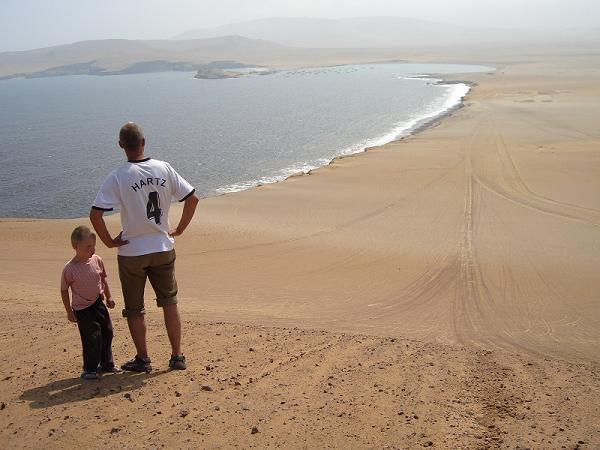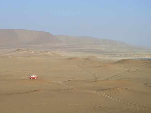 Im Nationalpark Paracas bleiben wir ein paar Tage. Wir fühlen ins wie in der Sahara. Kein Baum, kein Strauch nur Sand. Aber der ist so festgefahren, dass wir mit dem Bus fast überall hinkommen. Ein tolles gebiet für ein Fahrtraining auf Sand. Es geht sogar steile Dünen herab. Nur rauf kommen wir nicht - dazu ist der Motor zu schwach, oder die Dünen sind zu steil :-) Wir erholen uns hier ein paar Tage vor der langen Fahrt in den Norden.