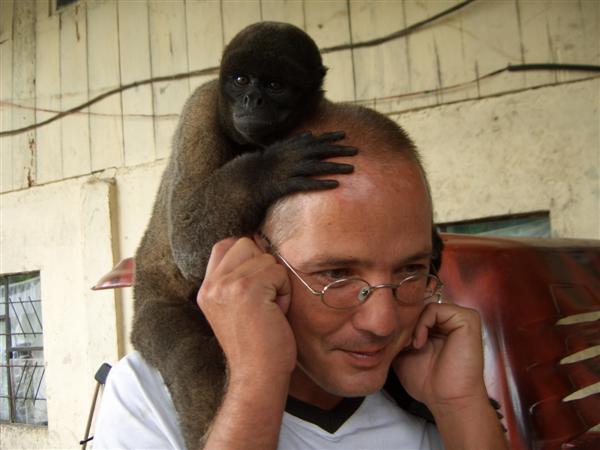 Da laust mich doch der Affe - die gibt es nämlich auch in Bananenrepubliken. Es ist schon ein komisches Gefühl von einem Affen mit einem Baum verwechselt zu werden. Ruck zuck sitzt er auf meiner Schulter und kuschelt sich an mich. Warm! Mit beweglichen Händen und Füssen wie bei einem Kind. Ich hoffe er muss nicht mal gerade eben... Und man weiss auch nie, ob er nicht doch beisst. Katrin packt den Affen von hinten und will mich befreien. Er hält sich an meinem Hals fest und kreischt wie am Spiess. Ich lockere seinen Würgegriff - das Tier hat richtig Kraft. Katrin und ich lassen beide gleichzeitig los. Die Schwerkraft bringt das Tier zu Boden, wo es sich schnell in den Wald entfernt.