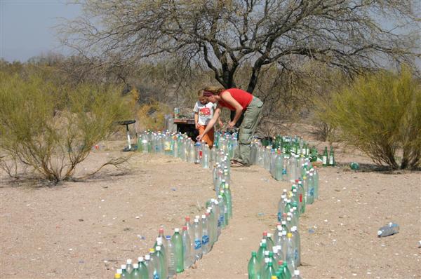 Unterwegs an den Strassen immer wieder Altare der "Difunta Correa". Hier verehren die Argentinier Maria Antonia Deolinda Correa. Maria machte sich im Bürgerkrieg 1841 mit ihrem Säugling auf dem Rücken auf den Weg, um ihrem Mann zu folgen, der von irgendwelchen Truppen gefangen gehalten wurde. Das scheint nicht weiter interessant, aber sie verlief sich in der Wüste und starb schliesslich an Hunger und Durst. Als ein paar Maultiertreiber ihre Leiche ein paar Tage später fanden, lebte das Kind immer noch und lag säugend an der Brust der toten Mutter. Für einen Europäer vielleicht immer noch nicht interessant, aber eben für Argentinier. Sie pilgern an Feiertagen zu tausenden an solche Schreine, denn diese Geschichte verbindet zwei Stereotypen im argentinischen Frauenbild: das Bild der treuen Frau, die ihrem Geliebten folgt, und das der sich aufopfernden Mutter. Geopfert werden meisstens wassergefüllte Plastikflaschen, aber auch Geld, Zigaretten, Bremsbeläge und sonstiger Schrott.
