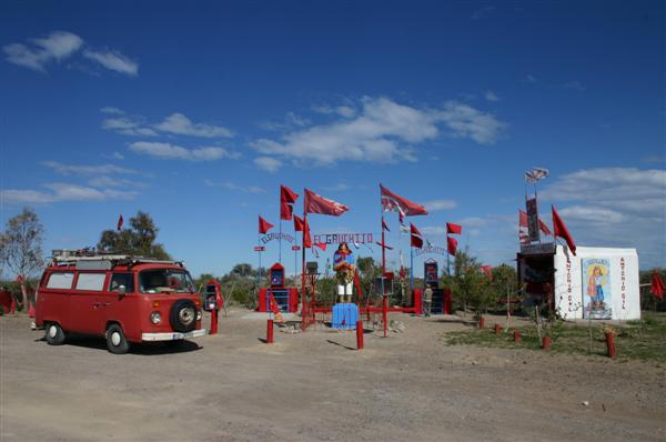 Seit dem findet man an vielen Strassen selbstgezimmerte Schreine für den Volksheiligen Gauchito Gil. Verziert sind sie mit roten flatternden Fähnchen, die bis heute das blutgetränkte Halstuch Gils symbolisieren. Gauchito Gil gilt als Beschützer all derjenigen, die auf langen einsamen Strecken unterwegs sind. Hier opfert man vor der Reise eine Kleinigkeit, oder hupt zumindestens im Vorbeifahren.